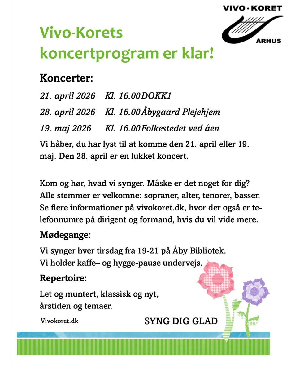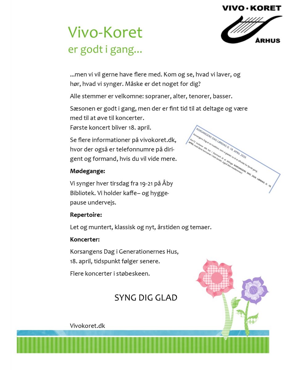 Velkommen til Vivo-KoretVivo-koret Århus er et blandet kor på ca. 20 sangere. Koret synger flerstemmigt med og uden klaverledsagelse.